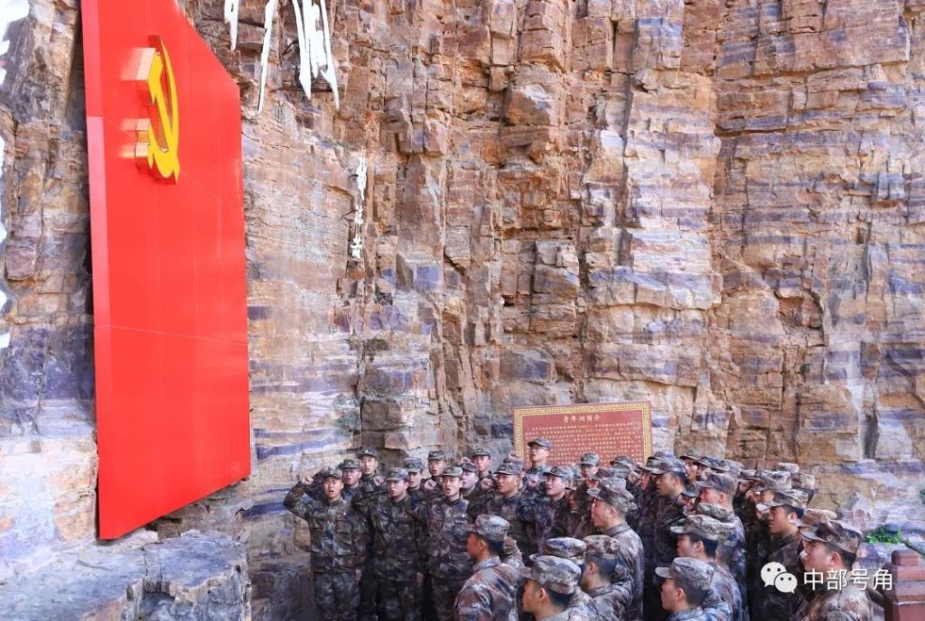 在“青年洞”邊上,新時代青年官兵面對鮮紅的黨旗莊嚴(yán)宣誓,高舉右拳,重溫入黨誓詞。擲地有聲的錚錚誓言響徹整個峽谷,更加堅定了官兵不忘初心、牢記使命的信心和信念。