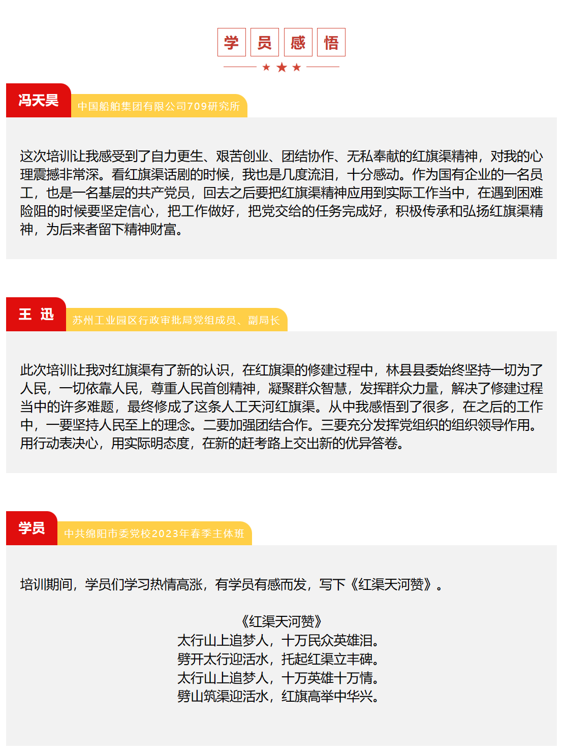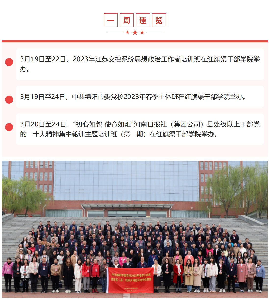 草木蔓發(fā),春山可望。3月19日至3月25日,紅旗渠干部學(xué)院迎來河南省委編辦學(xué)習(xí)貫徹黨的二十大精神輪訓(xùn)班(一期)、2023年寶山區(qū)處級干部進修班(第一期)、農(nóng)工黨河南省骨干黨員培訓(xùn)班、“初心如磐 使命如炬”河南日報社(集團公司)縣處級以上干部黨的二十大精神集中輪訓(xùn)主題培訓(xùn)班(第一期)等39個班次到院學(xué)習(xí)。