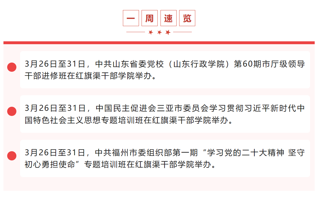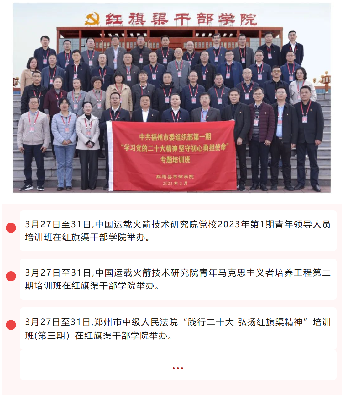 春潮澎湃起,揚帆正當時。3月25日至4月1日,紅旗渠干部學院迎來中共山東省委黨校(山東行政學院)第60期市廳級領(lǐng)導干部進修班、中國民主促進會三亞市委員會學習貫徹習近平新時代中國特色社會主義思想專題培訓班、中國運載火箭技術(shù)研究院黨校2023年第1期青年領(lǐng)導人員培訓班、中國運載火箭技術(shù)研究院青年馬克思主義者培養(yǎng)工程第二期培訓班、2023年寶山區(qū)處級干部進修班(第二期)等41個班次到院學習。