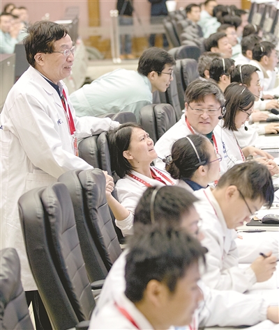 2019年1月3日,嫦娥四號落月的一刻,74歲的中國航天科技集團五院深空探測和空間科學首席科學家、嫦娥一號衛(wèi)星總設計師葉培建院士走向正在前排工作席的嫦娥四號探測器項目執(zhí)行總監(jiān)張熇,兩代“嫦娥人”的手,緊緊地握在了一起。新華社記者 金立旺 攝