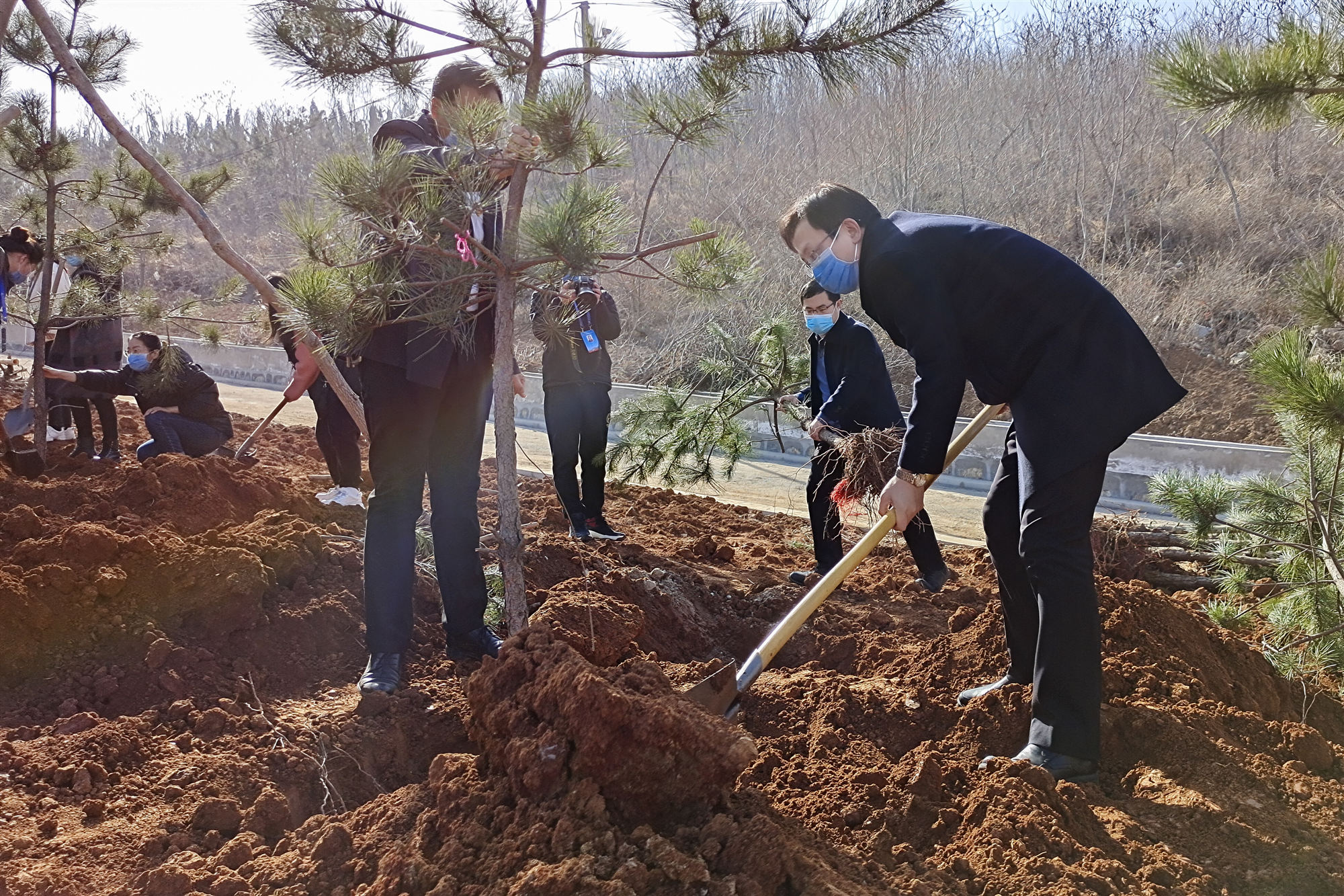 活動現(xiàn)場,黨旗飄揚,全體黨員充分發(fā)揮先鋒模范作用,紛紛把植樹綠化的“責任地”當作錘煉黨員黨性、轉(zhuǎn)變工作作風的“練兵場”,大家爭先恐后挖土、抬苗、培土、澆水,密切配合,干勁十足,經(jīng)過一上午的忙碌,一棵棵翠柏整齊地矗立在原本空蕩的山坡上,迎風而立煥發(fā)出勃勃生機,形成了一道靚麗的風景線。